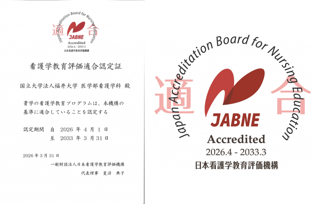 福井大学医学部看護学科は、JABNEの2025年度看護学教育評価を受審し、総合判定の結果「適合」の認定を受けました。認定期間は、2026年4月1日から2033年3月31日までです。